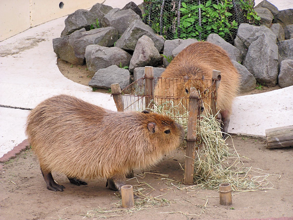無事入園し、ひよこを見にふれあい広場へ行く途中、こちらのカピバラさんたちの横を通ります。でかいけど、ネズミなんですよね。