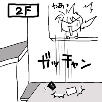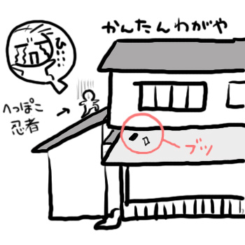 図で簡単に示すとこんな感じ。二階の窓から出て、下のわずかな隙間の屋根に降りてビデオテープを確保するという、字で説明するとすんごい簡単なことなんですが、実際屋根に上って下の足場に下りようとすると、