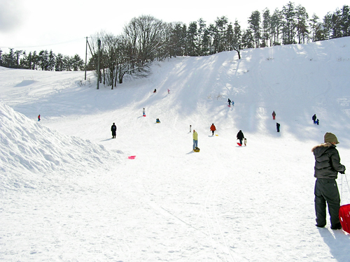 こちらのスキー場、左側がリフト乗り場になっていて、スキーやスノボの滑走場所になっています。右側がそり遊び用のスペースなんですね。