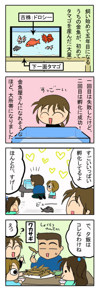 いちばん最初に産卵したとき、残念なことに全滅させてしまいましてね。かわいそうなことしたなーと反省していたのですが、なんと数日後にもう一度産卵をはじめてしまい。慌てて管理してみたところだったのです。感動しました……旦那さんは75匹くらいまで数えたそうですが、多分それより多いかも。最終的にどれだけ生き残るかは微妙ですが、できればみんな無事で育ってほしいなあ。